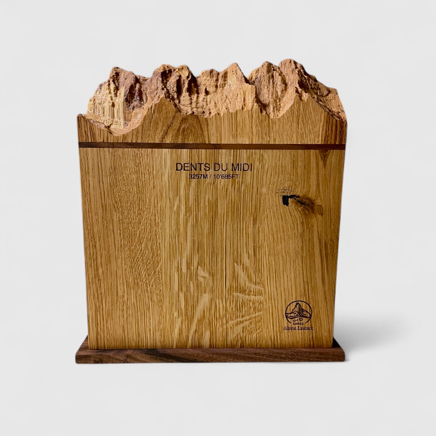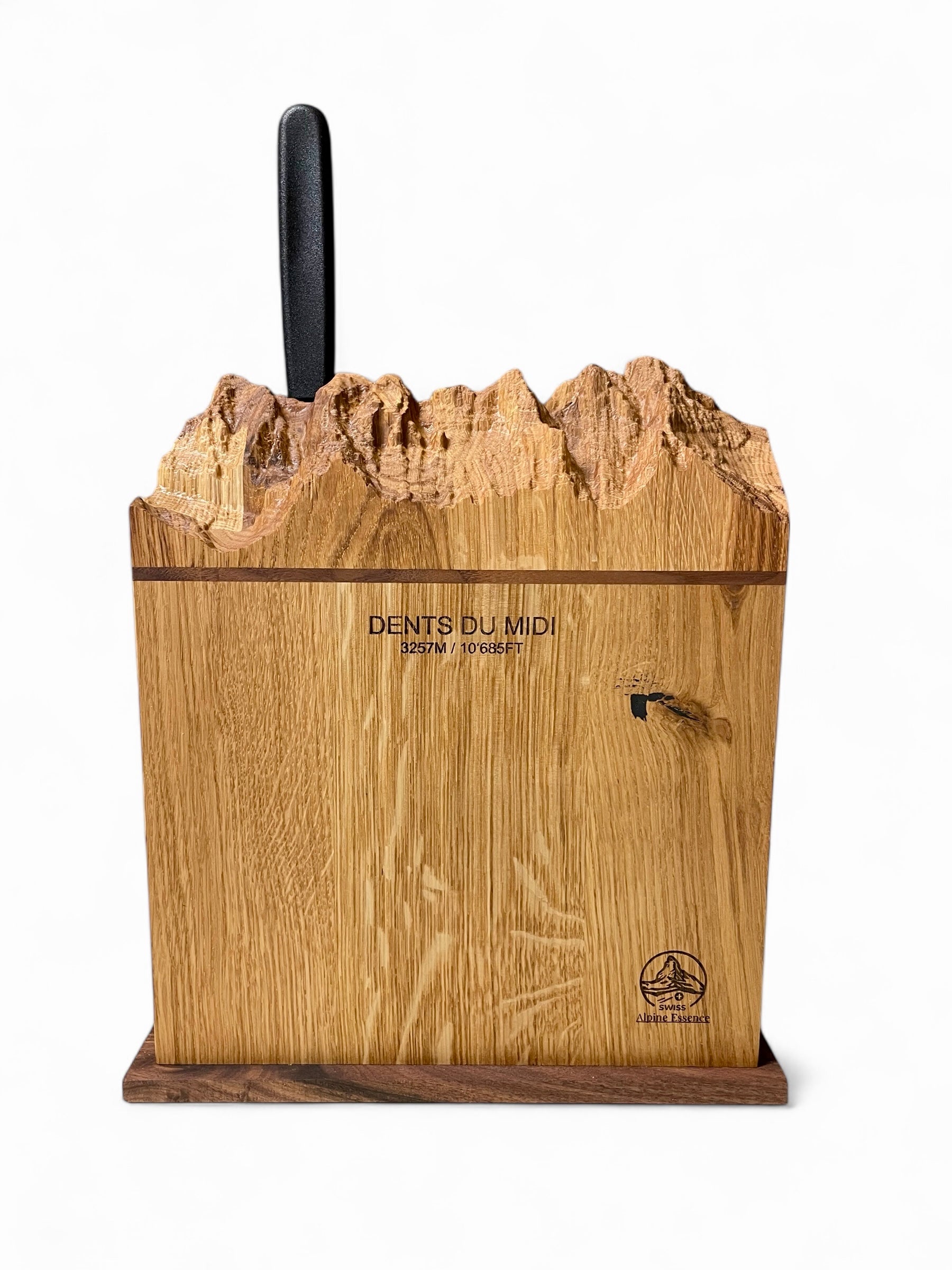 A piece of the Valais mountains for your kitchen: The exclusive "Dents du Midi – Timber Edition" knife block brings alpine elegance and handcrafted quality to your home. Crafted from solid oak and finished with a fine walnut accent line, the top edge forms the striking silhouette of the Dents du Midi – true to detail with its seven points.
