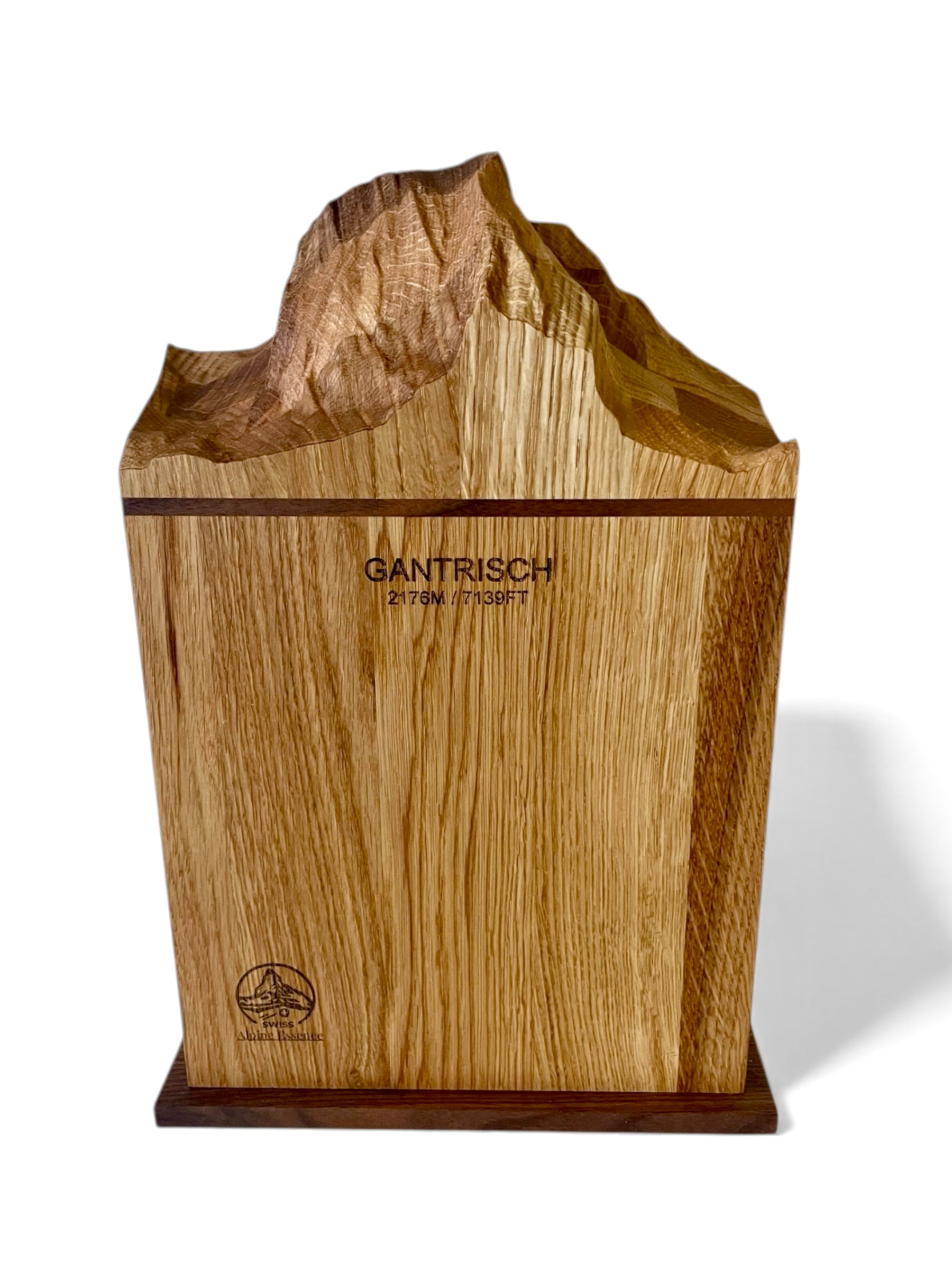 A piece of home from the Gantrisch region for your kitchen: The elegant "Gantrisch Uno" knife block brings rustic elegance and true craftsmanship to your home. Crafted from solid oak with subtle walnut accents, the top edge faithfully reproduces the characteristic silhouette of the Gantrisch .