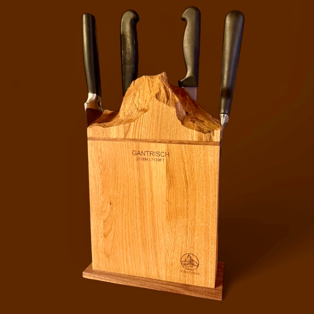 Ein Stück Heimat aus dem Gantrischgebiet für deine Küche: Der edle Messerblock „Gantrisch Uno“ bringt rustikale Eleganz und echte Handwerkskunst in dein Zuhause. Gefertigt aus massivem Eichenholz mit feinen Akzenten aus Nussbaum, bildet die Oberkante die charakteristische Silhouette des Gantrischs detailgetreu ab.