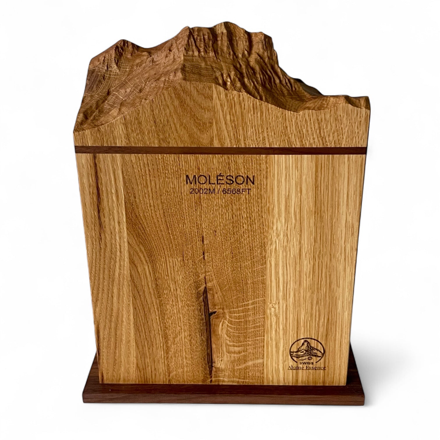 Der Hausberg der Freiburger Voralpen, jetzt in deiner Küche: Der Messerblock „Moléson – Timber Edition“ bringt alpine Wärme und echte Handwerkskunst in dein Zuhause. Gefertigt aus massivem Eichenholz und veredelt mit einer feinen Akzentlinie aus Nussbaum, bildet die Oberkante die markante Silhouette des Moléson – kraftvoll und unverwechselbar wie der Berg selbst.