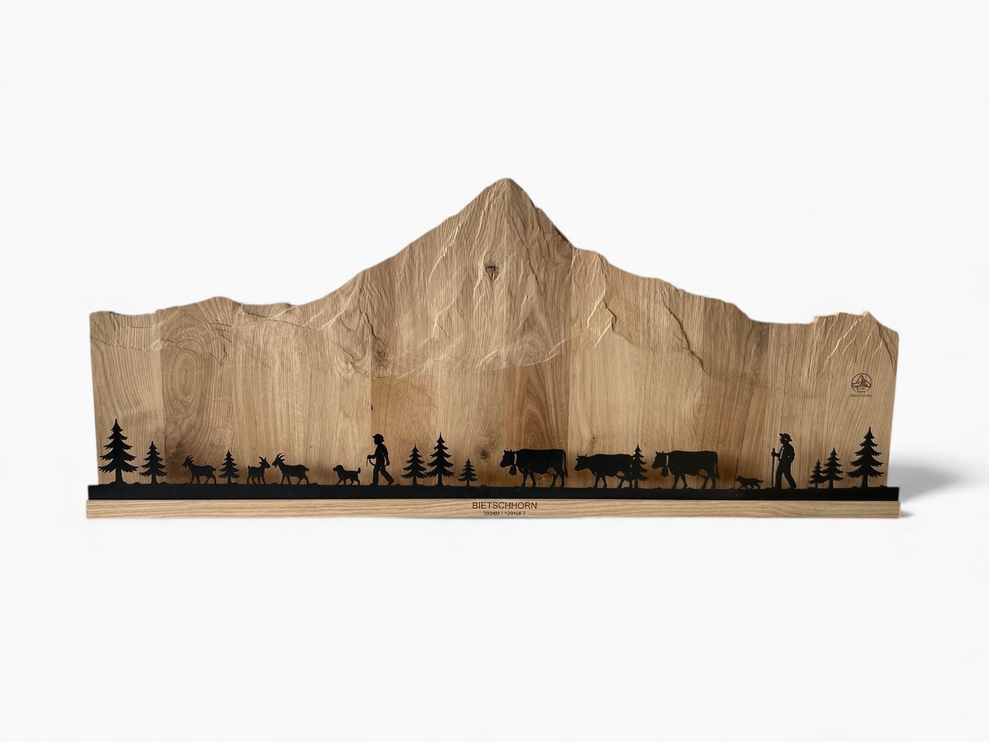 Dieses edle Wandbild zeigt den markanten Gipfel des Bietschhorn-Massivs – als fein gefrästes 3D-Holzrelief. Davor zieht ein traditioneller Alpabzug-Scherenschnitt durch die Landschaft.
