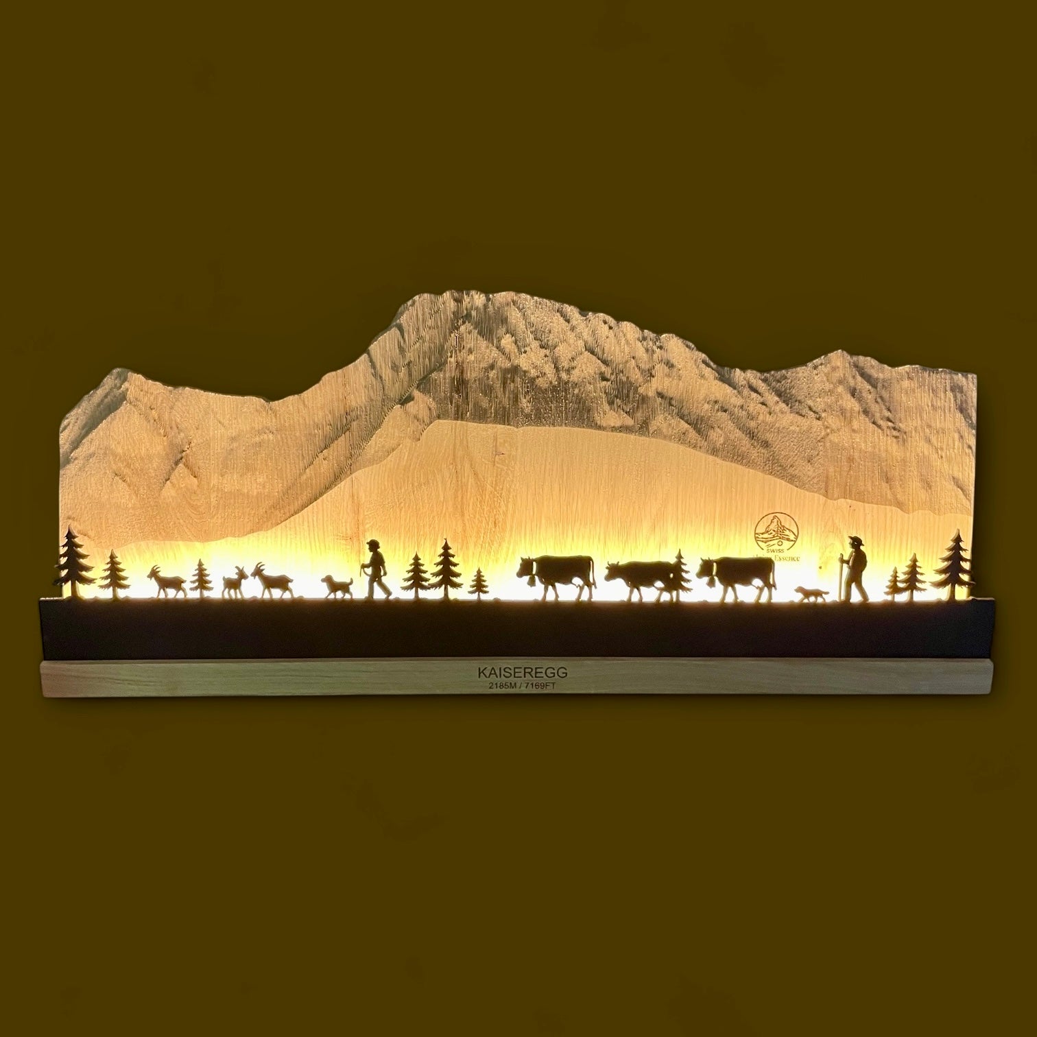Dieses edle Wandbild zeigt die markante Silhouette des Kaiseregg-Massivs – als fein gefrästes 3D-Holzrelief. Davor zieht ein traditioneller Alpabzug-Scherenschnitt durch die Landschaft.